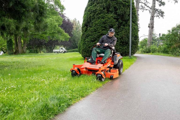 With a cutting width of 122 cm and its Kawasaki FR691 726 cm³ V-Twin engine, the APEX 48 is designed for commercial use on medium-sized and larger areas. It ejects the grass via its side discharge or can optionally be operated with a mulching kit (with closed side discharge). With a cutting width of 122 cm, it is particularly manoeuvrable between narrow obstacles and on contoured, undulating surfaces.