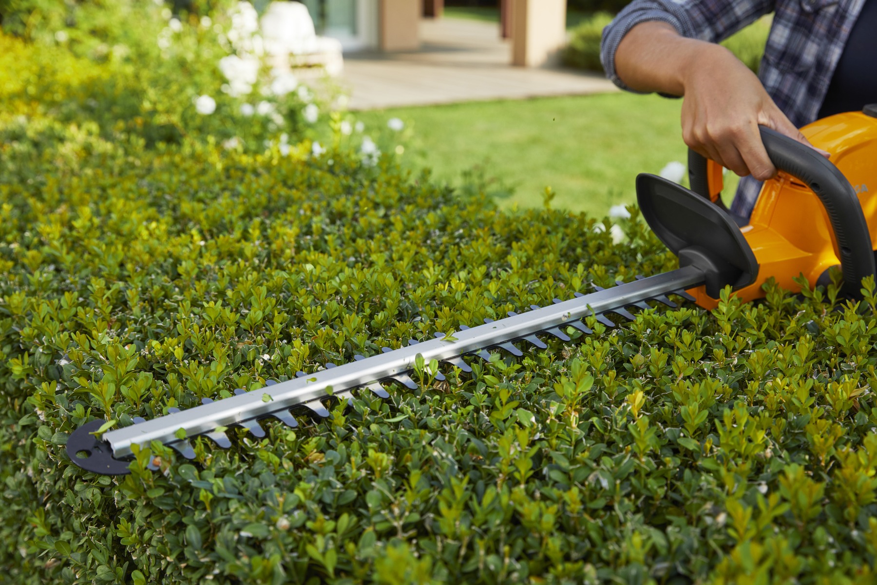 The HT 100e Kit (with battery 2,0 Ah) is a cordless hedge trimmer that makes light work of tough gardening jobs. With no trailing cables to get in the way, you’re free to let the hardened steel 55 cm long dual-action blade get cutting – trimming hedges and bushes with effortless precision.